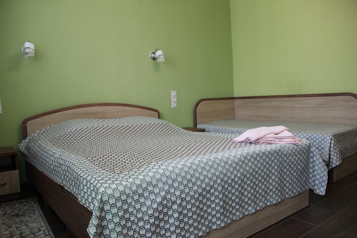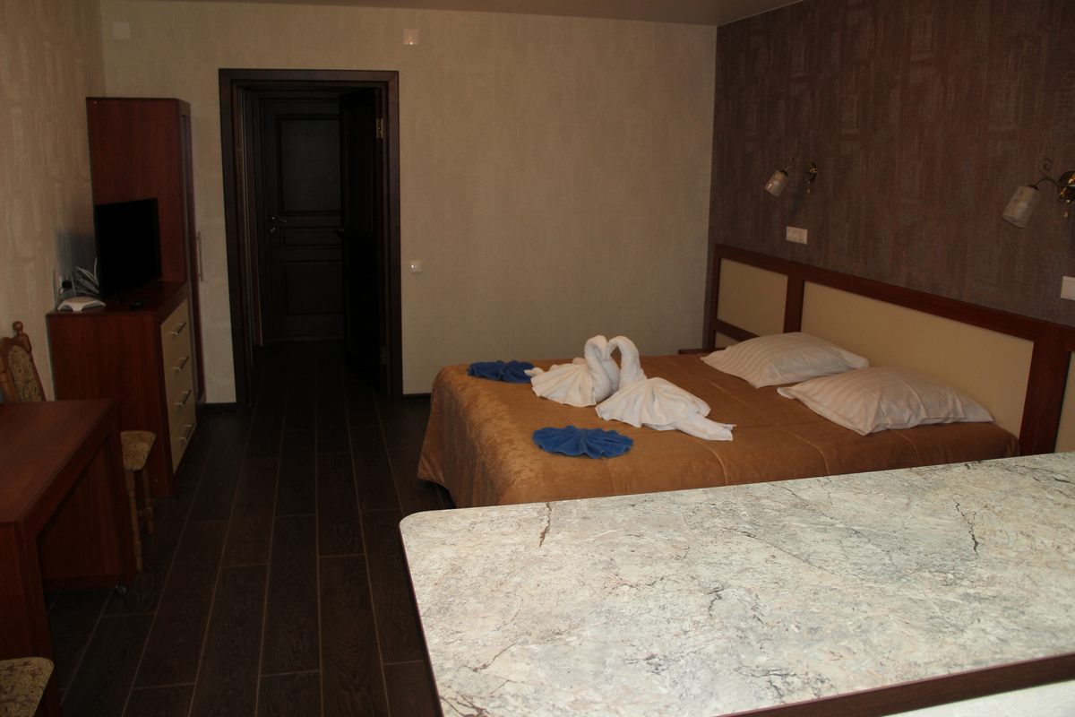 В номере: двуспальная кровать, прикроватные тумбы, стол, стулья, шкаф, тахта, телевизор, холодильник, электрочайник, утюг с гладильной доской, сушилка для белья, набор посуды
