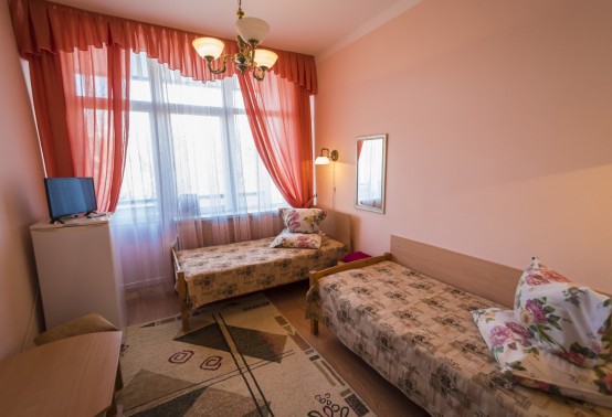 В номере: две односпальные кровати, прикроватные тумбы, встроенный шкаф, стол, кресло (или стул, или пуф), телевизор, холодильник, телефон, набор посуды